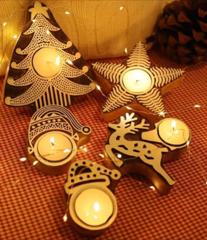 Festive handcrafted wooden tealight holders in classic Christmas shapes with intricate detailing.