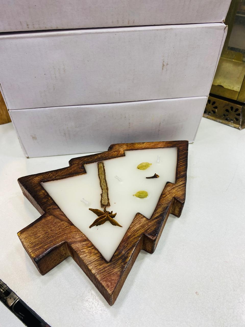 Stylish tree-shaped candle set in a natural wooden holder with aromatic botanical accents.