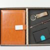 Present a gift of timeless elegance with our classic 4-in-1 executive gift set. This beautifully curated collection features a rich tan faux leather diary with a dedicated metal plate for logo engraving, a premium metal pen, a matching leather keychain, and a sleek card holder. Packaged in a handsome gift box, it is the ideal choice for Diwali corporate gifts, client appreciation, and new employee welcomes.