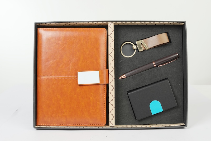 Present a gift of timeless elegance with our classic 4-in-1 executive gift set. This beautifully curated collection features a rich tan faux leather diary with a dedicated metal plate for logo engraving, a premium metal pen, a matching leather keychain, and a sleek card holder. Packaged in a handsome gift box, it is the ideal choice for Diwali corporate gifts, client appreciation, and new employee welcomes.