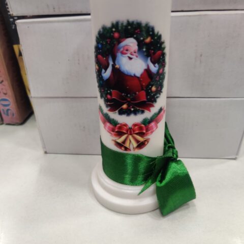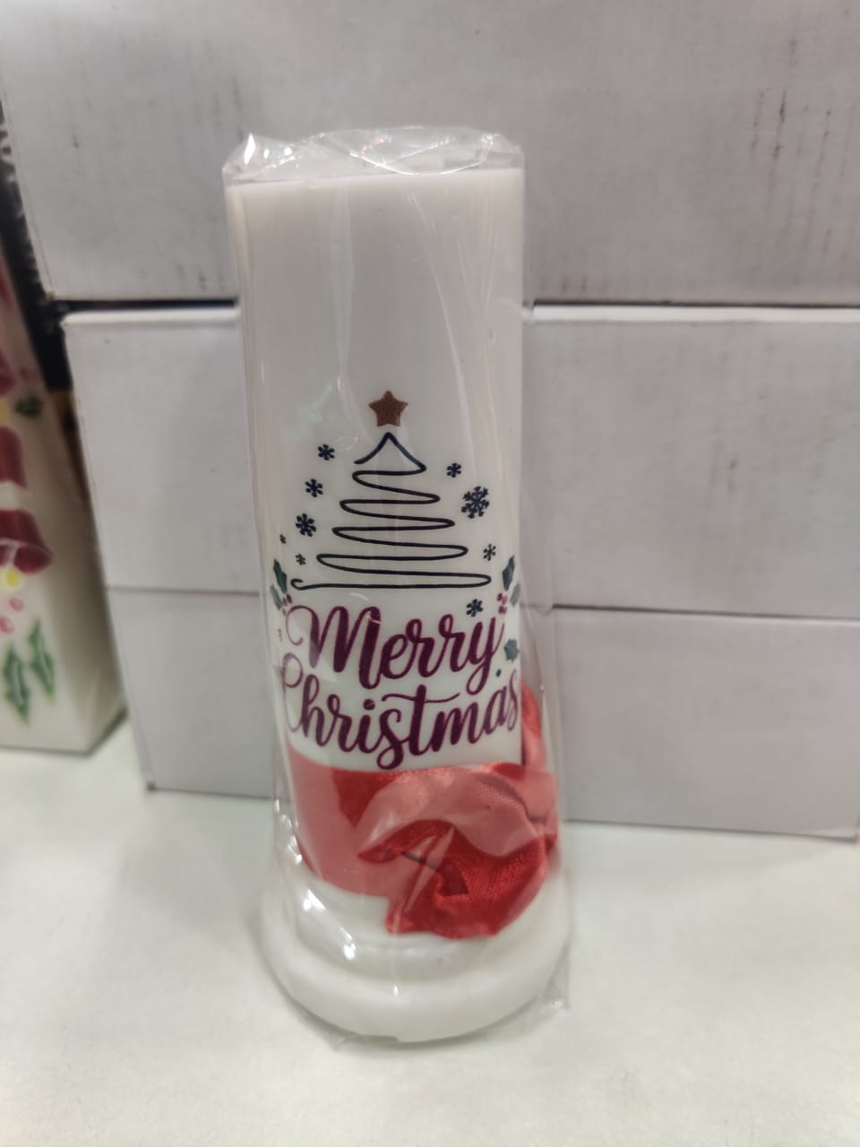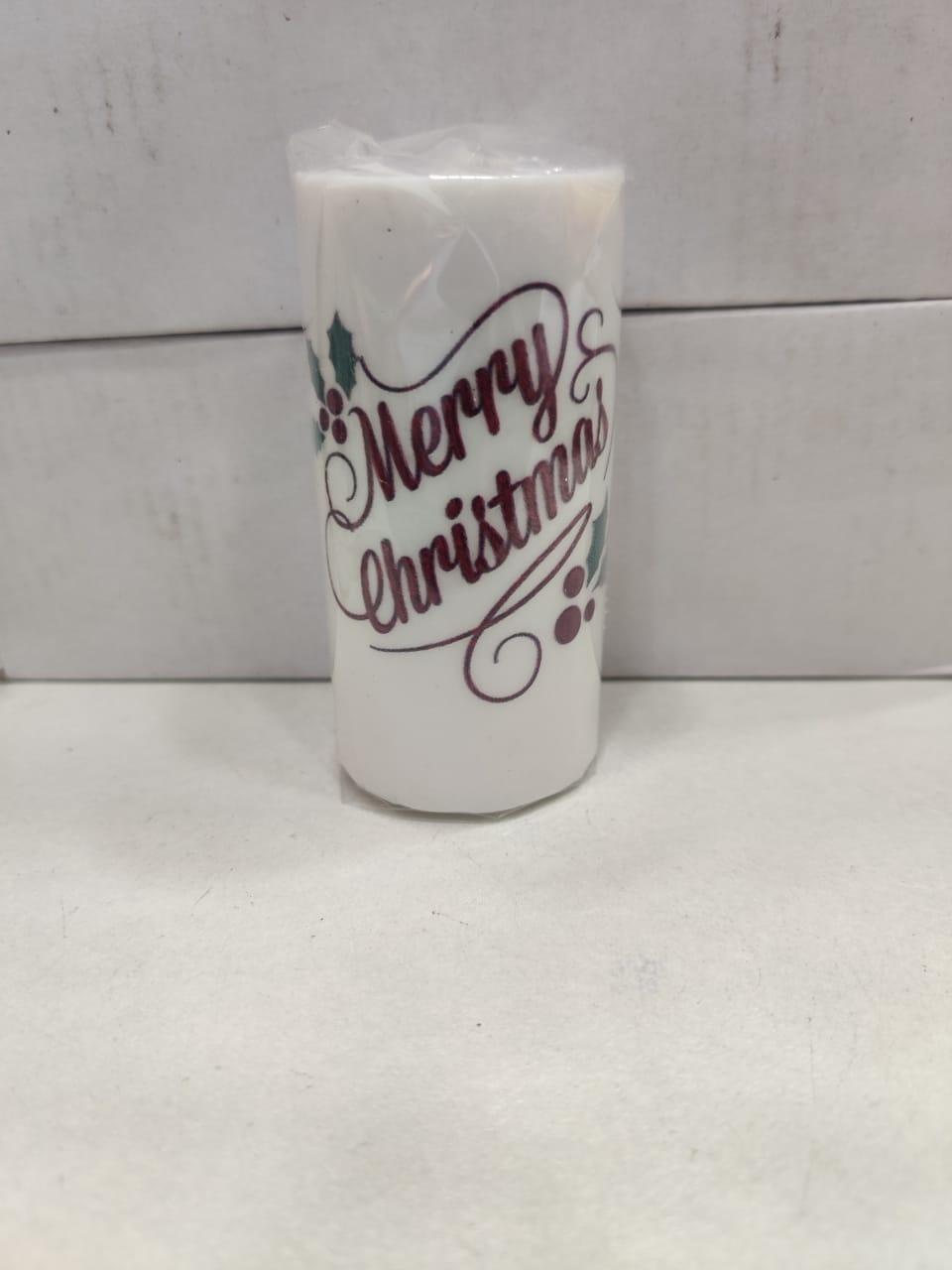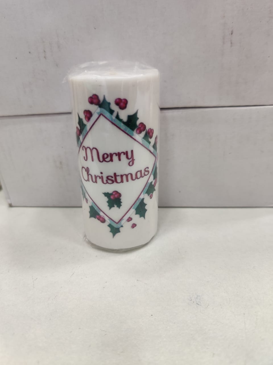 Festive white pillar candle featuring a classic holly and berry design with a “Merry Christmas” message. Perfect for holiday décor, table centerpieces, and seasonal gifting.