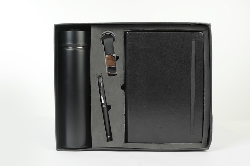 Step up your corporate gifting with our ultra-modern, all-black executive set. This sleek collection features a high-tech smart flask with an LED temperature display, a matching minimalist diary, a metal pen, and a stylish keychain. Packaged in a premium gift box, it’s the perfect tech-savvy gift for Diwali, client appreciation, or onboarding new employees. Ideal for custom branding with your company logo.