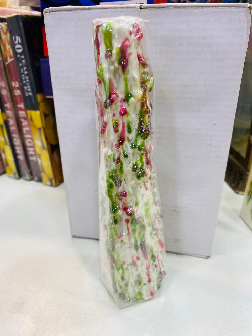 Tall decorative pillar candle with a festive multicolor wax pattern inspired by holiday lights.