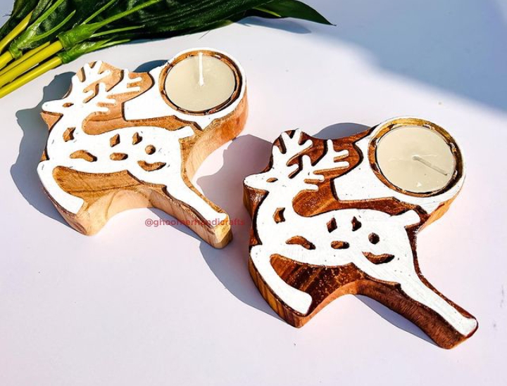 Handcrafted wooden tealight holder shaped like a festive reindeer with elegant white detailing.