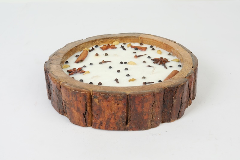 Ignite your senses with the warm, comforting aroma of Indian spices. This stunning artisan candle is hand-poured into a natural wooden bowl, complete with real tree bark for a truly rustic feel. The top is generously decorated with a beautiful medley of whole spices like cinnamon, star anise, and cloves. It’s not just a candle, but a multi-sensory experience and a beautiful rustic centerpiece for your home.