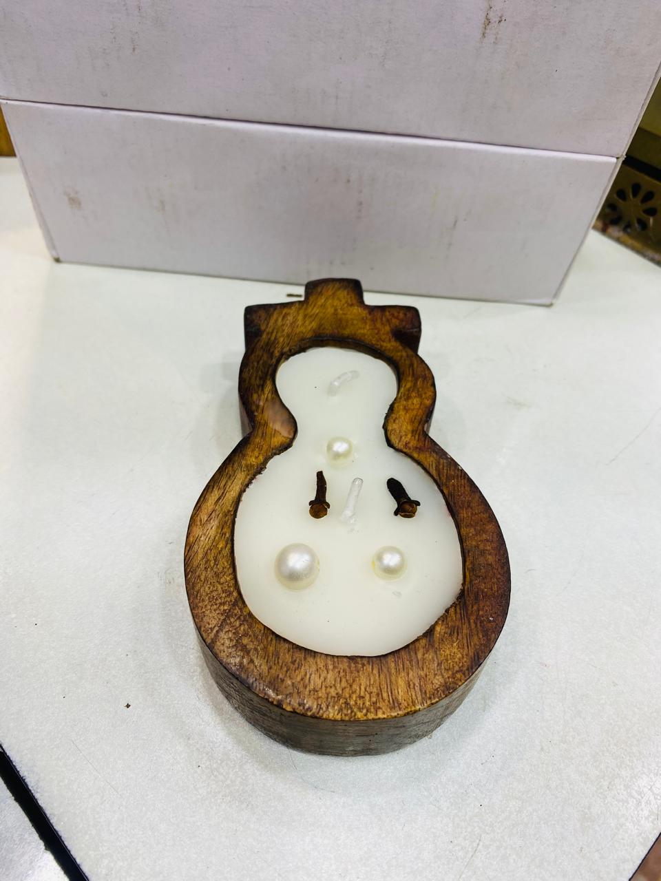 Festive snowman-shaped candle set in a natural wooden holder with decorative accents.