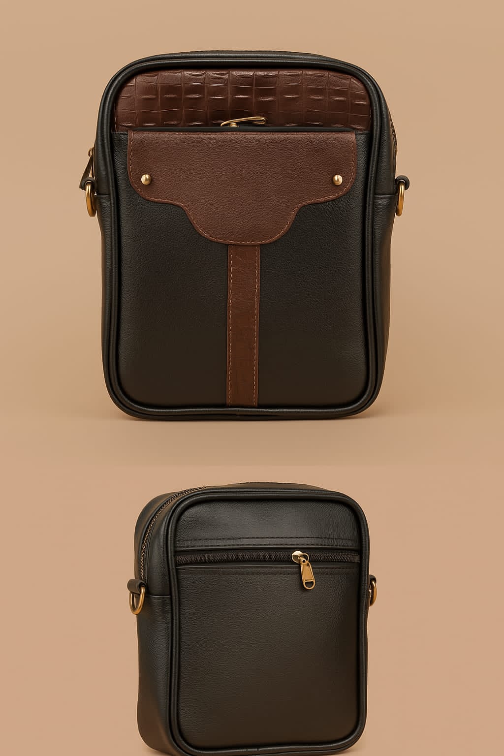 A modern sling bag featuring a sleek design with black and brown faux-croc leather accents. Compact and stylish for carrying your daily essentials.